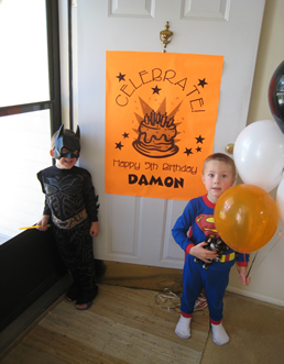 Damon turned 5 this week and his favorite holiday is Halloween. He says it's because you get candy (of course!) and because everyone gets to dress up. So this year Damon insisted on a Halloween birthday party. This encouraged his friends to get their costumes a little earlier this year, but we had a blast! They bobbed for apples, lightsabered in the dark basement, DARTH VADER came and fought/scared the kids, had a ghost pinata (which Mommy made-I couldn't justify spending $20 on a pinata that didn't even have candy in it!), then opened presents and cupcakes with spiders on top... YUM!!!