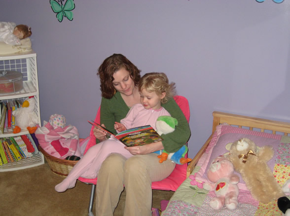 Our Aunt Kate just cut her long hair and has a fun new hair style. The kids hardly noticed, they just LOVE being with their Kate! Kate's reading to Kylie before tucking her into bed.